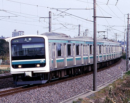 年々通勤客が増加する取手以北の交流区間へ直通できるよう、通勤型電車としては初の交直両用と した電車です。直流用の京浜東北線の209系と同じ外観ですが、足周りは独のシーメンス社製の VVVFインバータ制御を使用し最高速度120km/h対応の近郊型仕様となっています。現在は15両 編成が4本投入されて、上野−土浦間で運転されています。いまのところ、415系の運用を補完 しているにすぎないですが、将来的には取手までの103系の快速電車を置き換えて土浦まで延長 する方向になるでしょう。