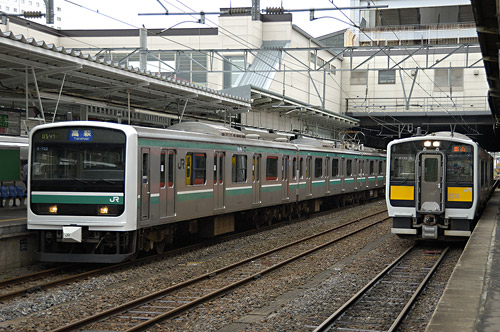 水戸駅で水郡線のキハE130と並ぶE501系 2007/8/18撮影